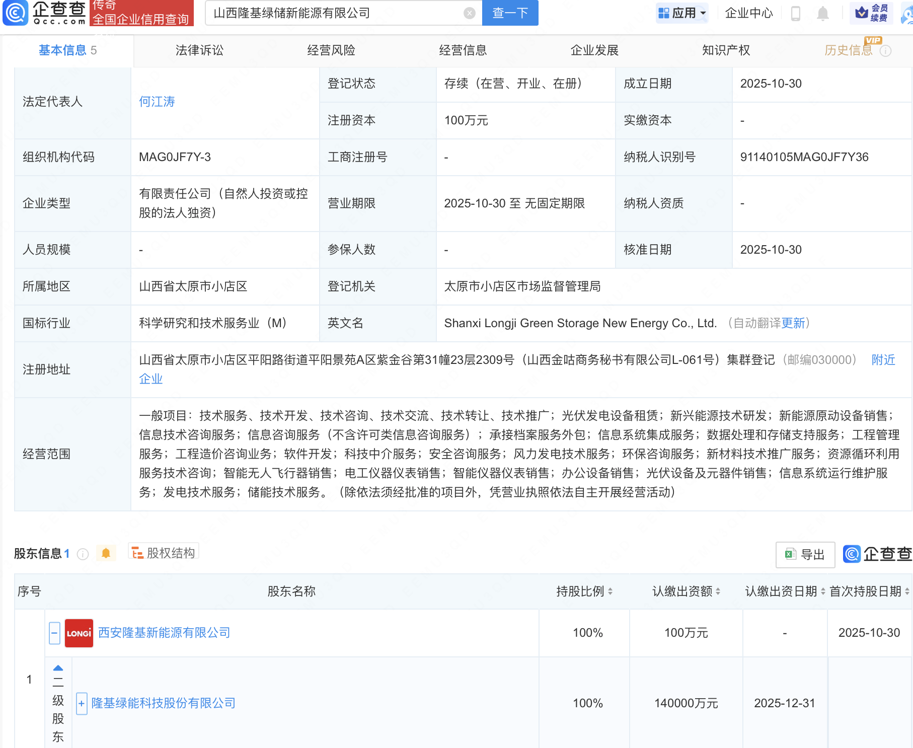 近日股票配资平台app,山西隆基绿储新能源有限公司成立,经营范围包含:新兴能源技术研发;新能源原动设备销售;资源循环利用服务技术咨询;智能无人飞行器销售等。企查查股权穿透显示,该公司由隆基绿能(601012)间接全资持股。