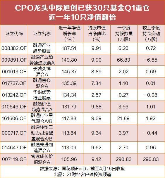 或受益于CPO行业的高景气带来的上涨动力,截至4月17日一季报披露数据,已有10只重仓中际旭创的基金实现净值一年内翻倍。其中,截至4月16日,融通产业趋势股票净值一年内涨超180%。该基金押注CPO赛道,重仓前三名分别为新易盛、中际旭创、东山精密,持仓净值占比均超9%,而源杰科技、天孚通信等多只热门CPO概念股亦在其重仓之列。