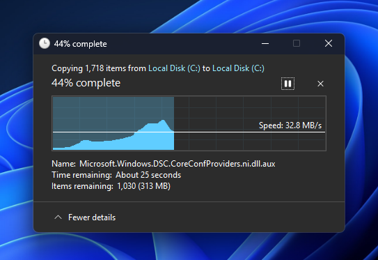 在最新的Win11Dev与Beta预览版中,微软为文件属性窗口、复制/粘贴对话框等界面增加了深色模式支持。同时,该对话框的经典绿色进度条被替换为蓝色,以匹配Windows11默认的配色方案。